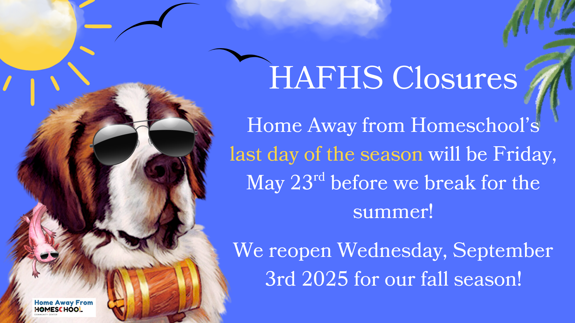 Home Away from Homeschool’s last day of the season will be Friday, May 23rd before we break for the summer!